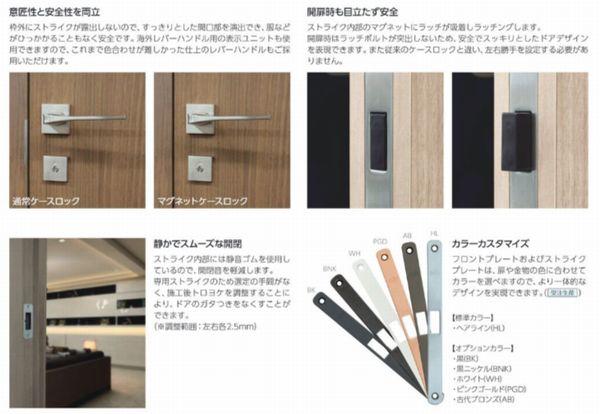 | 製品情報 | 【ヨーロッパ仕様のスリムケース】 ヨーロッパに多い、枠にかぶせるタイプのドアに使用されるスリムなケースです。 すっきりとしたデザインと共に、 手ごたえのあるハンドル操作感とラッチングはドアの高級感を引出します。 マグネットラッチは自動施錠はしないので、 誤って鍵をかけたままの状態で扉を閉めても締め出しされません。 |